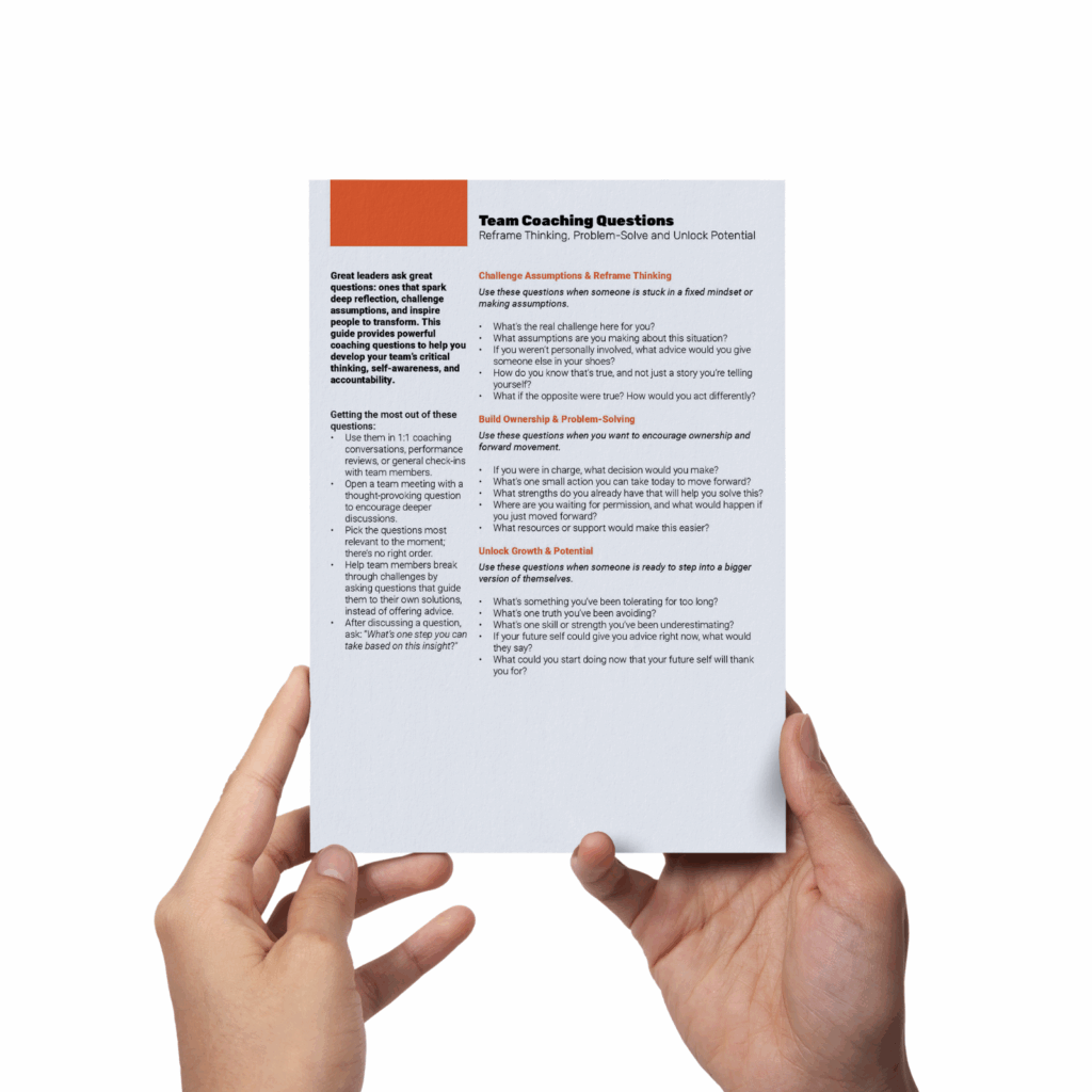 Great leadership is built on curiosity, clarity and meaningful conversations. Access simple, thought-provoking questions to help you reframe challenges, spark fresh thinking and unlock your team’s potential.